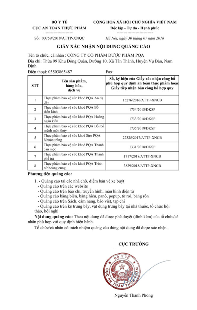 SẢN PHẨM ĐƯỢC CỤC AN TOÀN THỰC PHẨM – BỘ Y TẾ CẤP GIẤY XÁC NHẬN NỘI DUNG QUẢNG CÁO